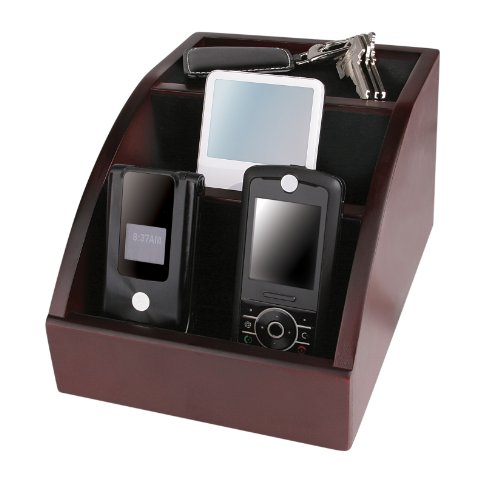 Mini docking station for charging and storing digital devices, two compartments accommodate four or more devices. Charge cords tuck away neatly
